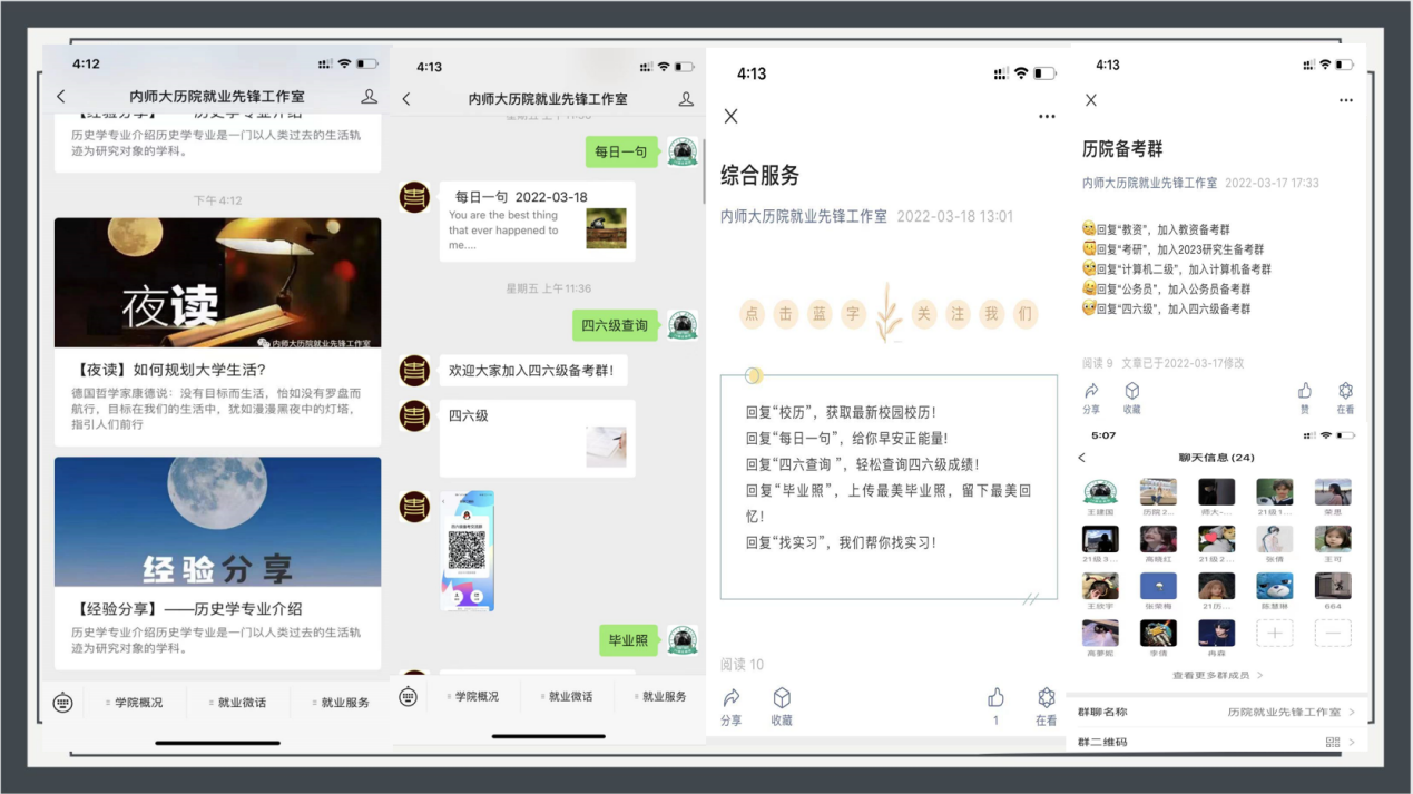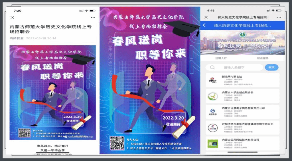 面对新冠肺炎疫情给就业工作带来的新挑战,学院主动出击,找单位、找岗位、找信息。加大需求信息的搜集和发布力度的同时,进一步挖掘校友、专业教师等资源。3月20日至25日举行内蒙古师范大学pg游戏电子模拟器“春风送岗·职等你来”网络双选会,邀请62家企业为毕业生提供岗位需求206个。学院于3月18日面向重点群体举办“赋能你我·共创未来”大学生创新创业系列讲座,内容涵盖创新创业、赋能你我、创业政策、互联网+等,通过“线上知识讲授+一对一咨询答疑”的形式,助力重点群体学生顺利就业。学院开通就业先锋微信公众号,专题推送就业信息,开辟“师哥师姐说”栏目,邀请已就业毕业生现身说法,传授求职经验。