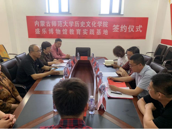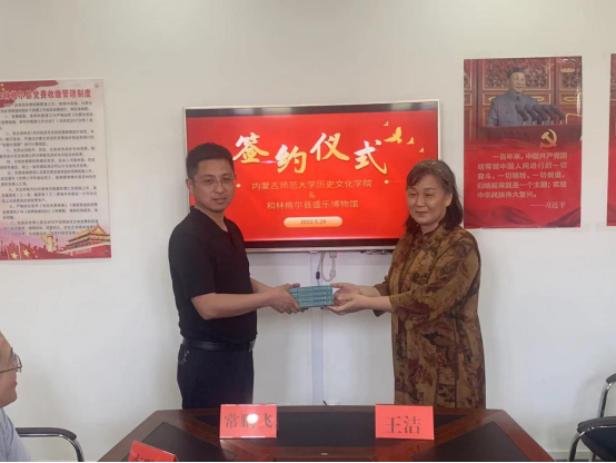 李艳洁院长与赵强胜馆长代表双方签署了相关合作协议;张升书记代表学院向盛乐博物馆授予“内蒙古师范大学pg游戏电子模拟器教育实践基地”牌匾;王洁老师向盛乐博物馆赠送由我院曹永年教授牵头编著的《内蒙古通史》。
