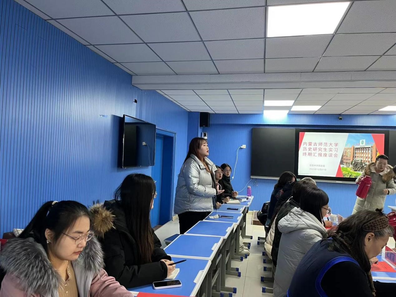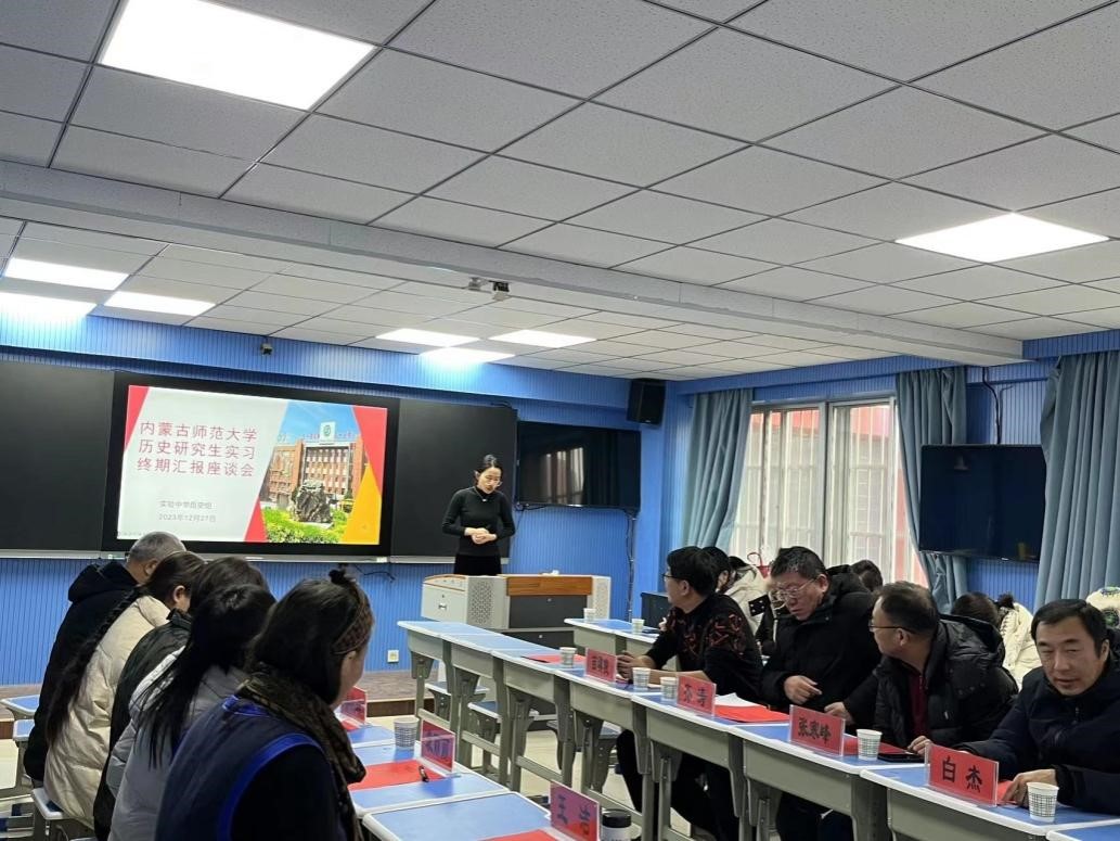 2023年12月27日上午,2022级学科教学论(历史)部分研究生在呼和浩特实验中学鼓楼校区实习终期汇报座谈会议顺利召开。呼和浩特实验中学参加会议的有苗琪俊、齐涛、张寒峰三位副校长、教务处白杰主任,以及历史组全体教师,内蒙古师范大学pg游戏电子模拟器参会老师有:党委书记李艳洁、研究生导师郭永胜教授、乌兰其木格教授、王洁副教授、袁丽丽副教授、苏日古嘎副教授,以及赴实验中学实习的研究生。