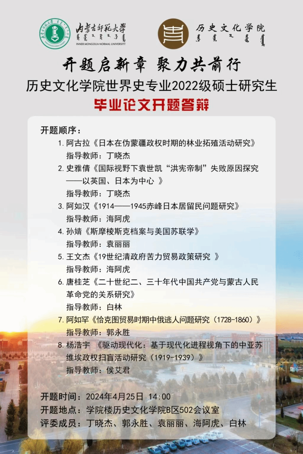2022级世界史硕士研究生阿古拉、史雅倩、阿如汉、孙婧、王文杰、唐桂芝、阿如罕、杨浩宇8名同学们在答辩会上展示了他们的初步研究方向和计划,题目涵盖了世界史领域的多个重要时期和议题,展示了同学们的学术兴趣和研究潜力。2023级世界史研究生也应邀参加了本次活动,作为旁听生,他们有机会了解前辈们的研究方向和思路,为自己日后的研究工作提供了宝贵的借鉴。