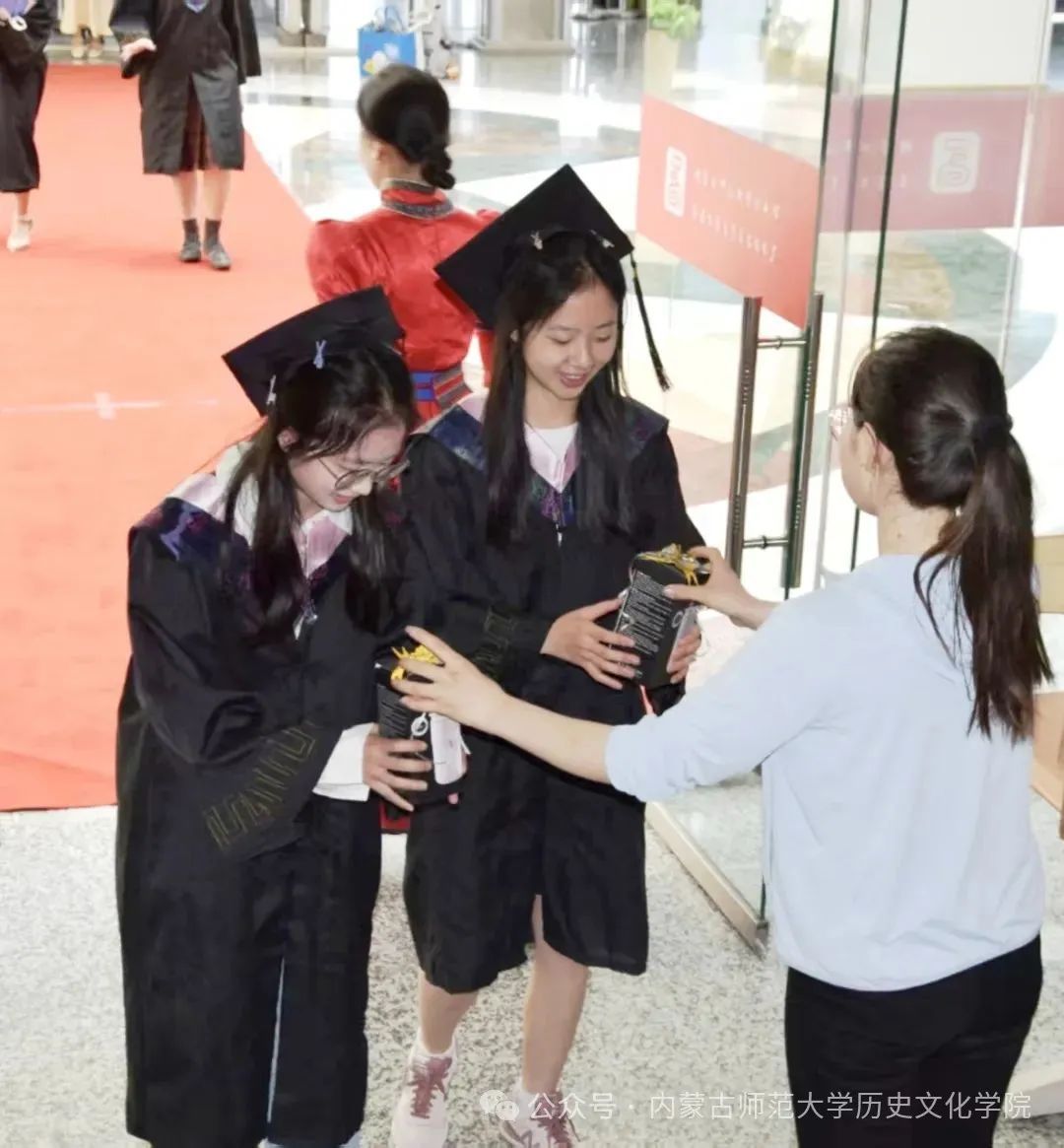 典礼开始前,毕业生们陆续步入会场,在镜头前合影留念,并领取学院精心准备的毕业礼物。