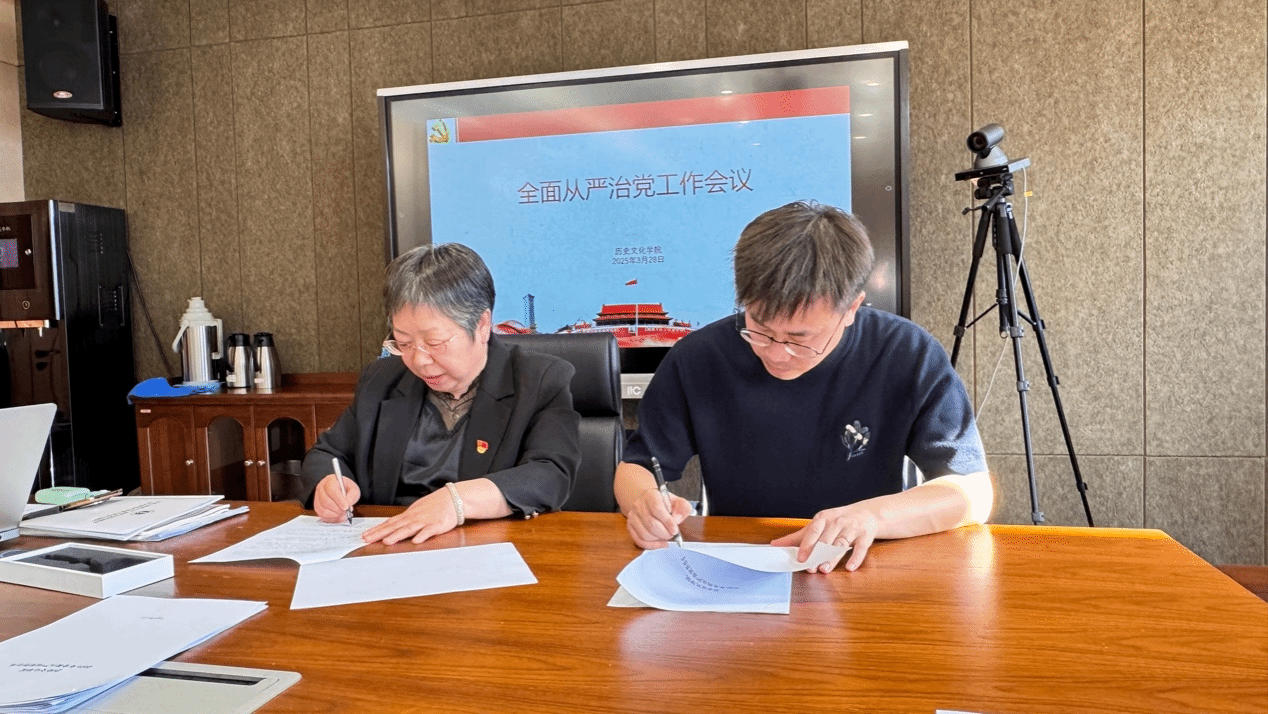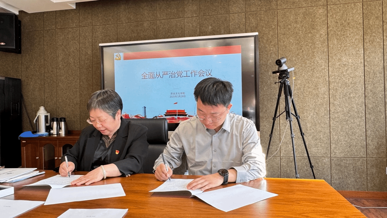 会议第三项,由党委书记李艳洁与各支部书记,系主任,教研室主任签署2025年度全面从严治党目标责任书。