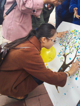 在这次宣传活动中,pg游戏心语馨苑工作站一共准备了三个小活动。我知我心:工作人员准备了三道针对压力应对,生活态度,抑郁自测的心理测试题,并将题目写在了展板上,且将答案打印出来以便同学们查看领取。树愈心灵:工作人员开辟出一块展板,上面绘制了一棵大树干,由同学们进行手印墙的现场绘制,同学们可以选择喜欢的颜料和位置,来为大树增添色彩。最后手印墙上会呈现出一棵由手印绘成的大树。来呼应此次“心灵健康,和谐师大”的主题。幸福传递:工作人员将从同学手中收集到的带有祝福话语的纸条汇集在一起,发给沿路的同学,让他们感受陌生人带来的温暖。同时也可以写出自己的祝福话语,将幸福传递给更多的人。