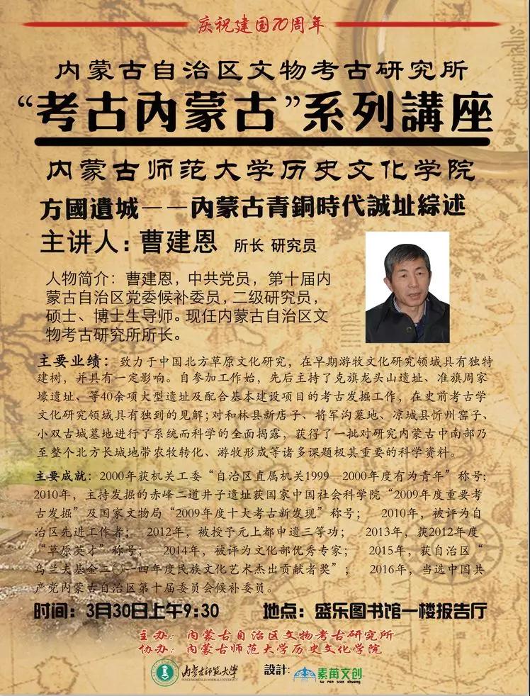 第一场讲座是2019年3月30日(周六)上午9:30于内蒙古师范大学盛乐校区图书馆一楼报告厅由内蒙古自治区文物考古研究所所长曹建恩带来关于方国遗城——内蒙古青铜时代城址综述的分享。主要内容如下: