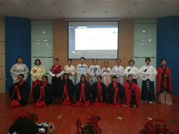 讲座接近尾声,来自汉阳博物馆的演员们表演了舞蹈《礼仪之邦》,并介绍了汉服和汉礼的相关知识,还让同学们进行穿戴汉服的比赛,讲座进入高潮。最后,学院下设汉服社的同学们身着华丽的汉服款款走上台,通过展现汉服的华美为本次讲座划上圆满句号。