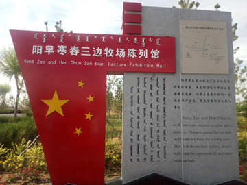 在城川嘎查宥州古城东600米处,有一座将延安窑洞风格与现代风格巧妙结合建筑而成的陈列馆,这就是阳早寒春三边牧场陈列馆。牧场位于陕北的安边、定边、靖边三县交界处,故而取名“三边牧场”。陈列馆正前方是一处绿意盎然的微型牧场,油绿平整的草地上,以阳早、寒春夫妇在三边牧场生活工作场景为主题的雕塑,这是他们一生扎根中国、无私奉献的真实写照。