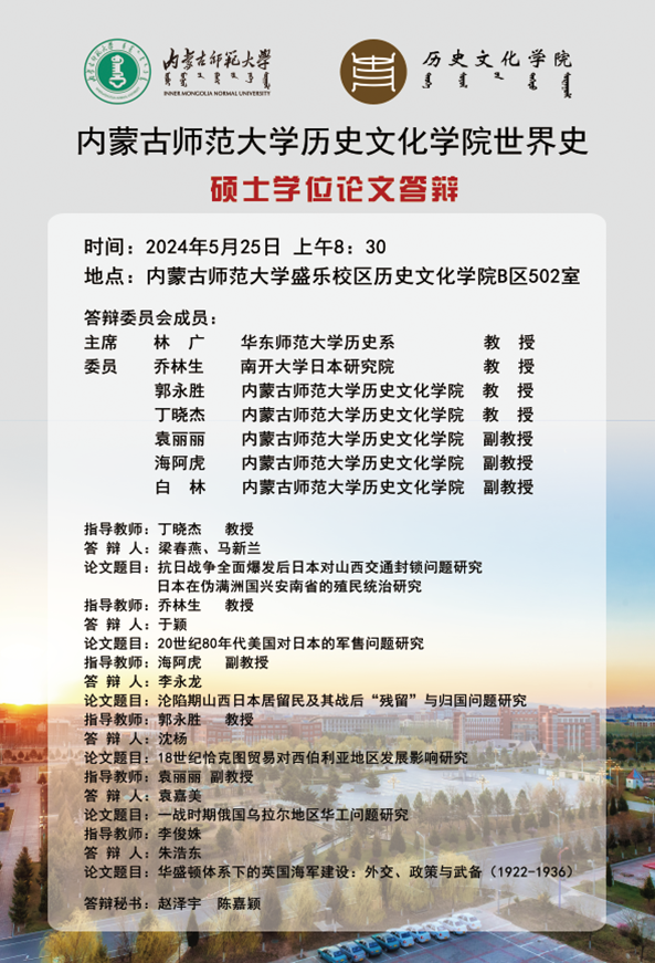 答辩会邀请了华东师范大学历史系林广教授担任答辩委员会主席,答委成员包括南开大学日本研究院乔林生教授、内蒙古师范大学pg游戏电子模拟器郭永胜教授、丁晓杰教授、袁丽丽副教授、海阿虎副教授和白林副教授。此外,世界史研究生赵泽宇和陈嘉颖担任答辩秘书。出席答辩会的还有21级7位同学,他们参加硕士学位论文答辩并陈述了各自的毕业论文,22级和23级的世界史专业研究生也到场旁听。